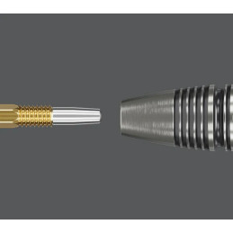 Das lasergravierte Rautenmuster an der Spitze geht fließend in den gefrästen Fire-Grip über und sorgt für stabilen Halt in der Dartscheibe.